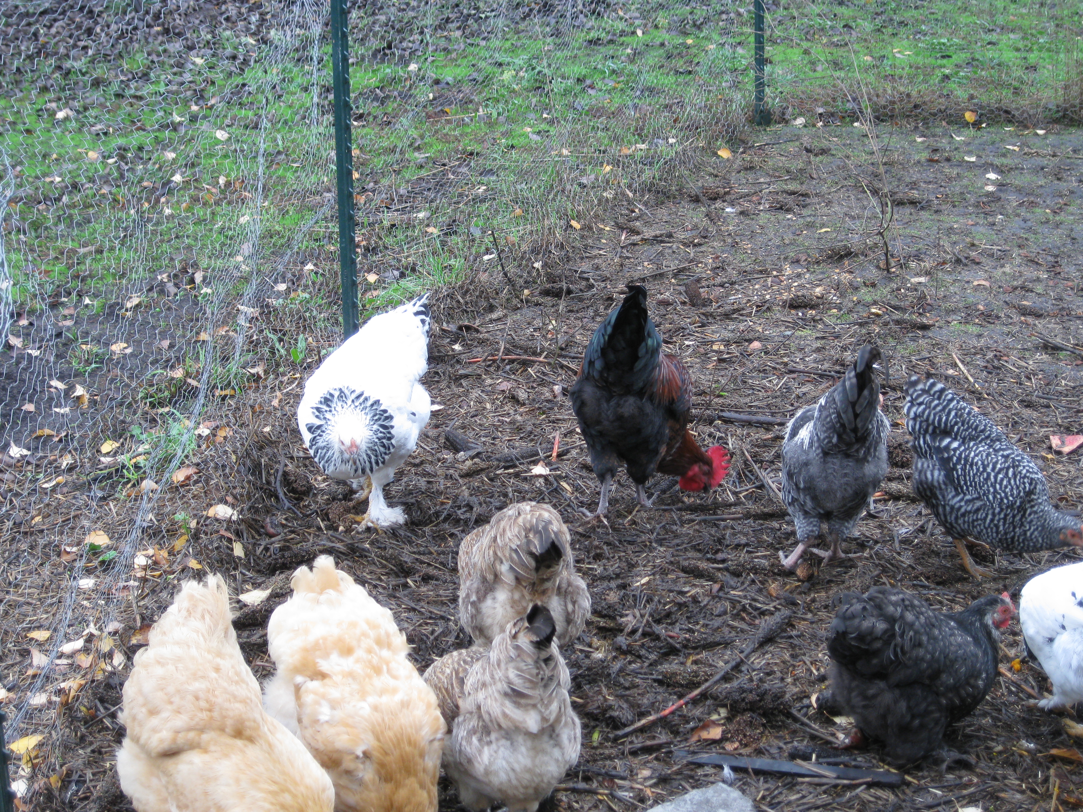We assumed that our chickens would be able to select from the supplemental items we were giving them in nutritionally optimal proportions; however, I’m not sure this is always true. After we had been feeding supplemental rations in a haphazard way, a couple of our meat chickens showed symptoms of fatty liver upon butchering: their livers were pale, enlarged, and broke apart easily. Then a favorite bantam hen got sick, and was positively diagnosed with fatty liver by the UCD Avian Pathology Lab. This made us immediately stop and reconsider our feed strategy.