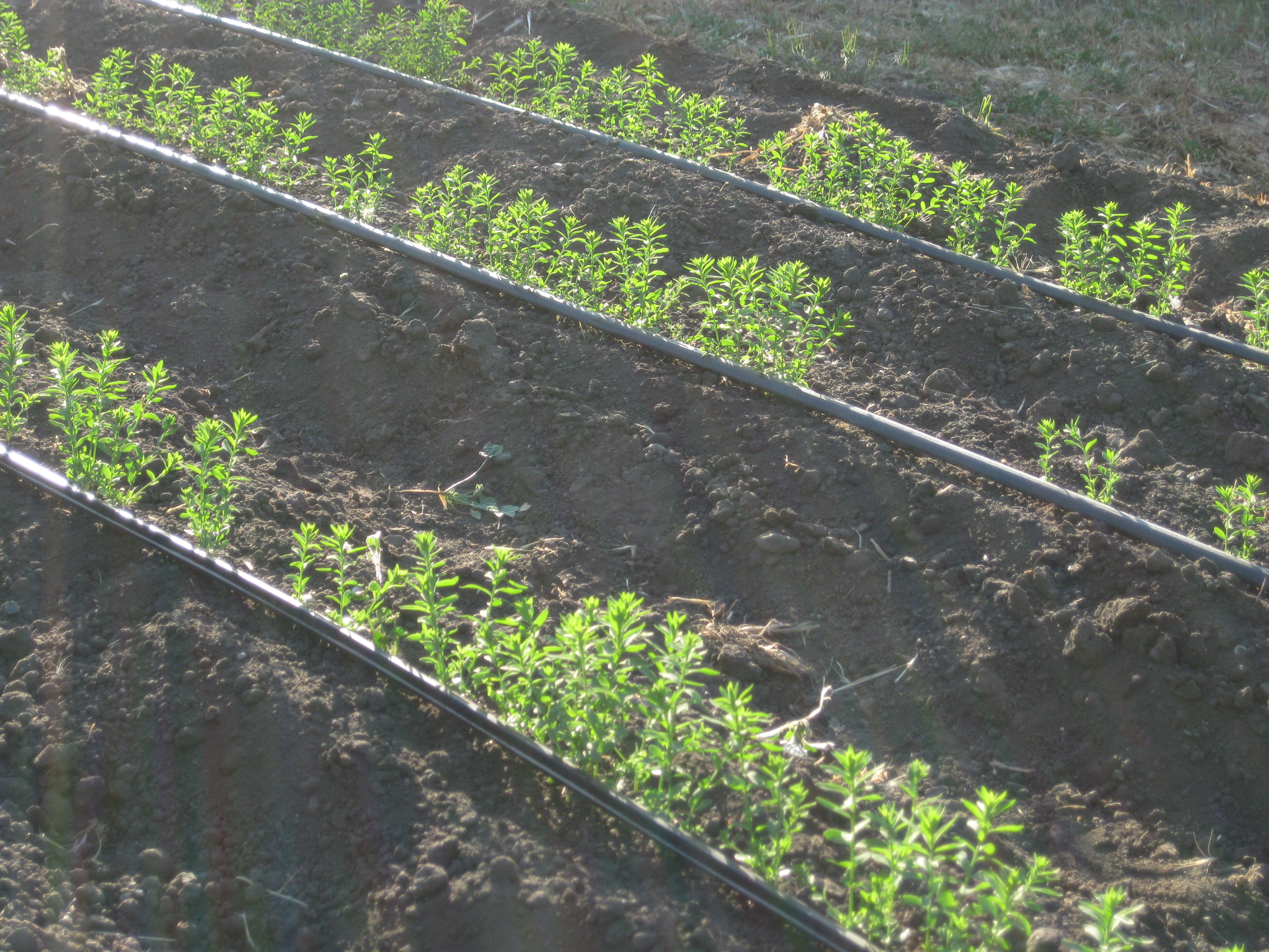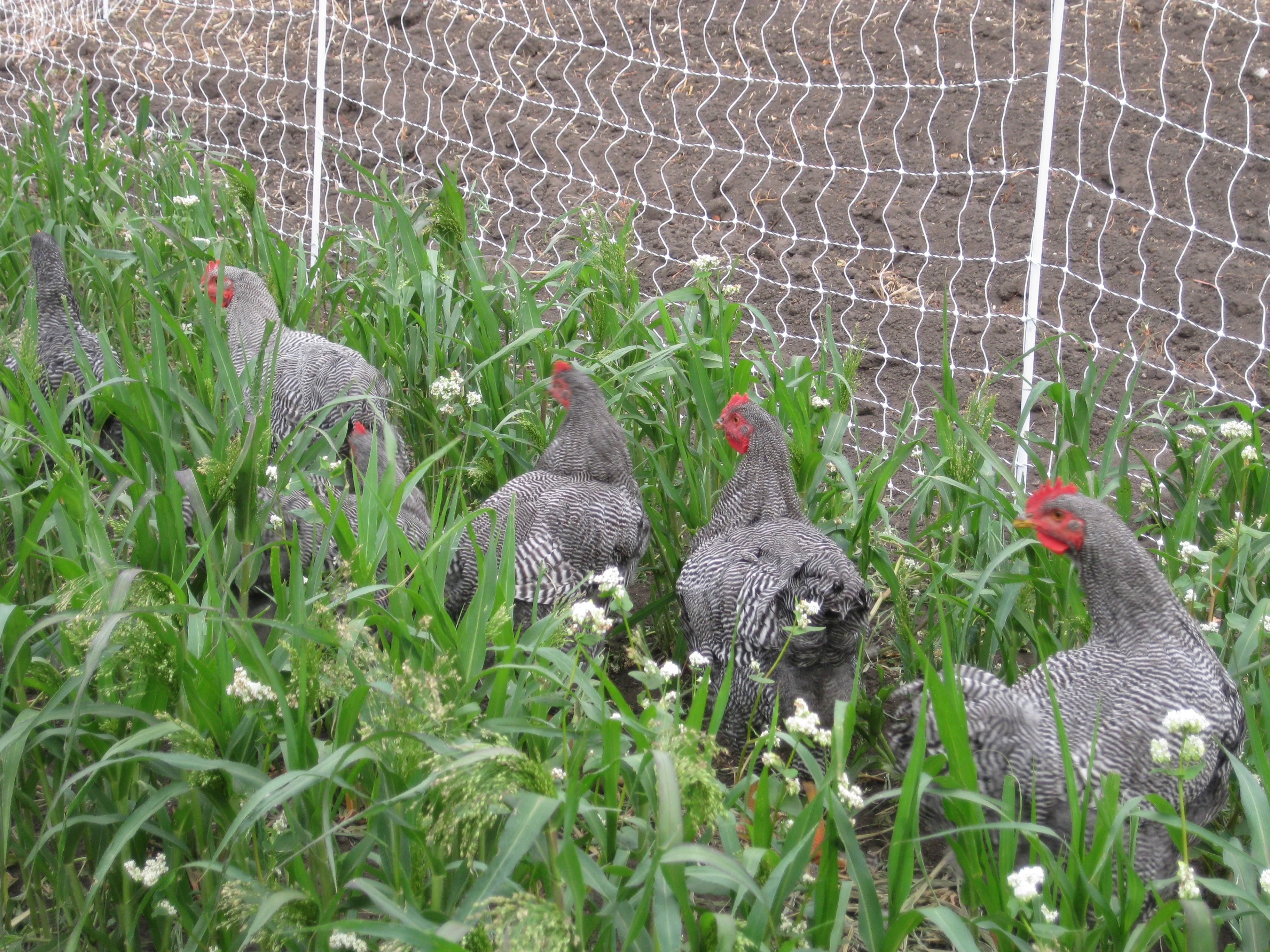 While we work out the best dry feed diet, we have also been focusing on the pasture development. We set up a rotational pasture-type system, using sequential plantings of a mix of crops and re-working the beds between plantings. We plant a seasonally variable mixture that includes oats, millet, flax, peas, white and red clovers, and alfalfa, moving the chickens to a new planting monthly.