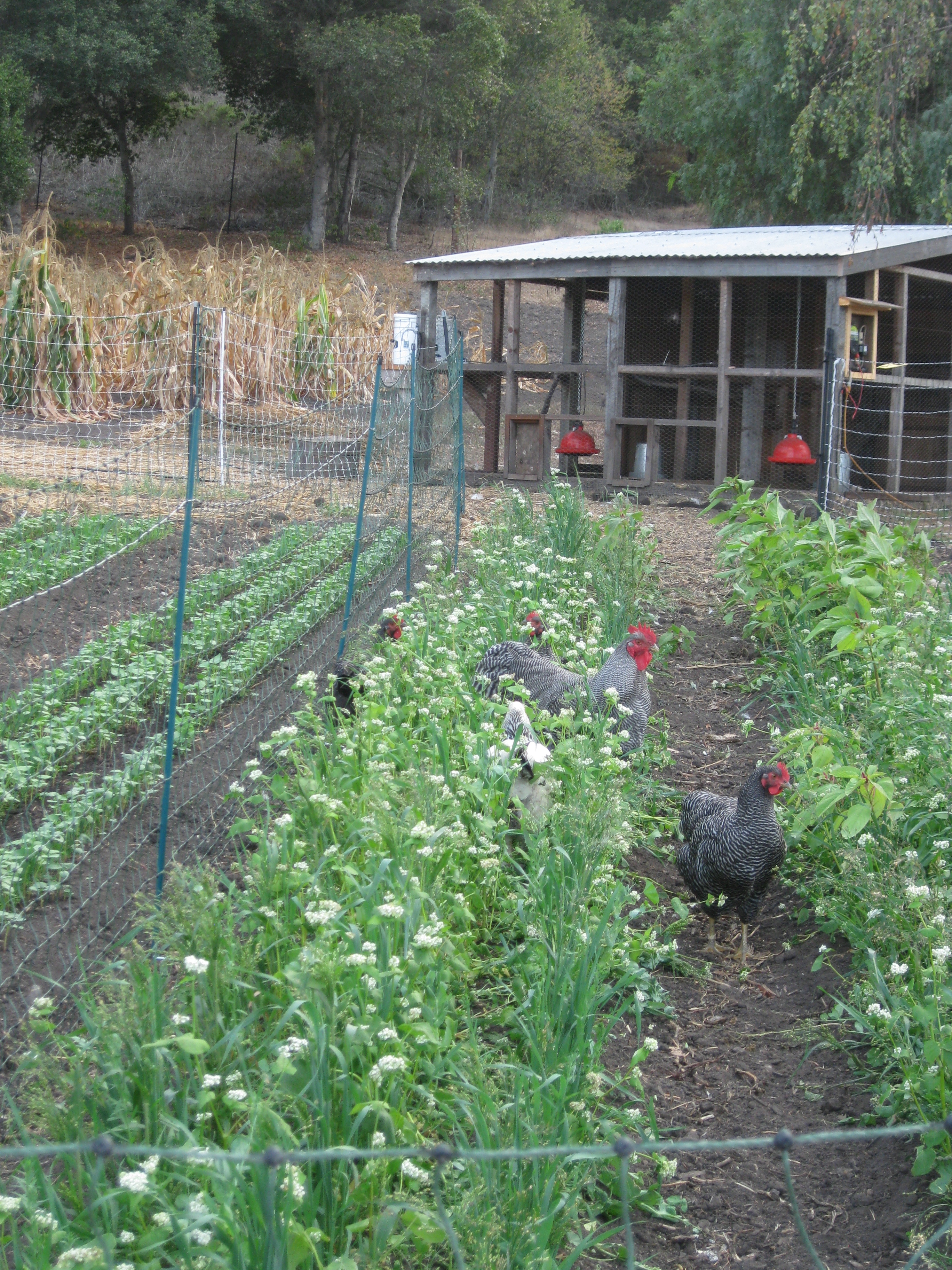 When we first got chickens we fed them mostly with purchased organic feed (we started with Modesto Milling, and later moved to Scratch and Peck, which the chickens love), supplemented with kitchen scraps and whatever bugs and plants they could scrounge from our property, over which they had free range at the time.