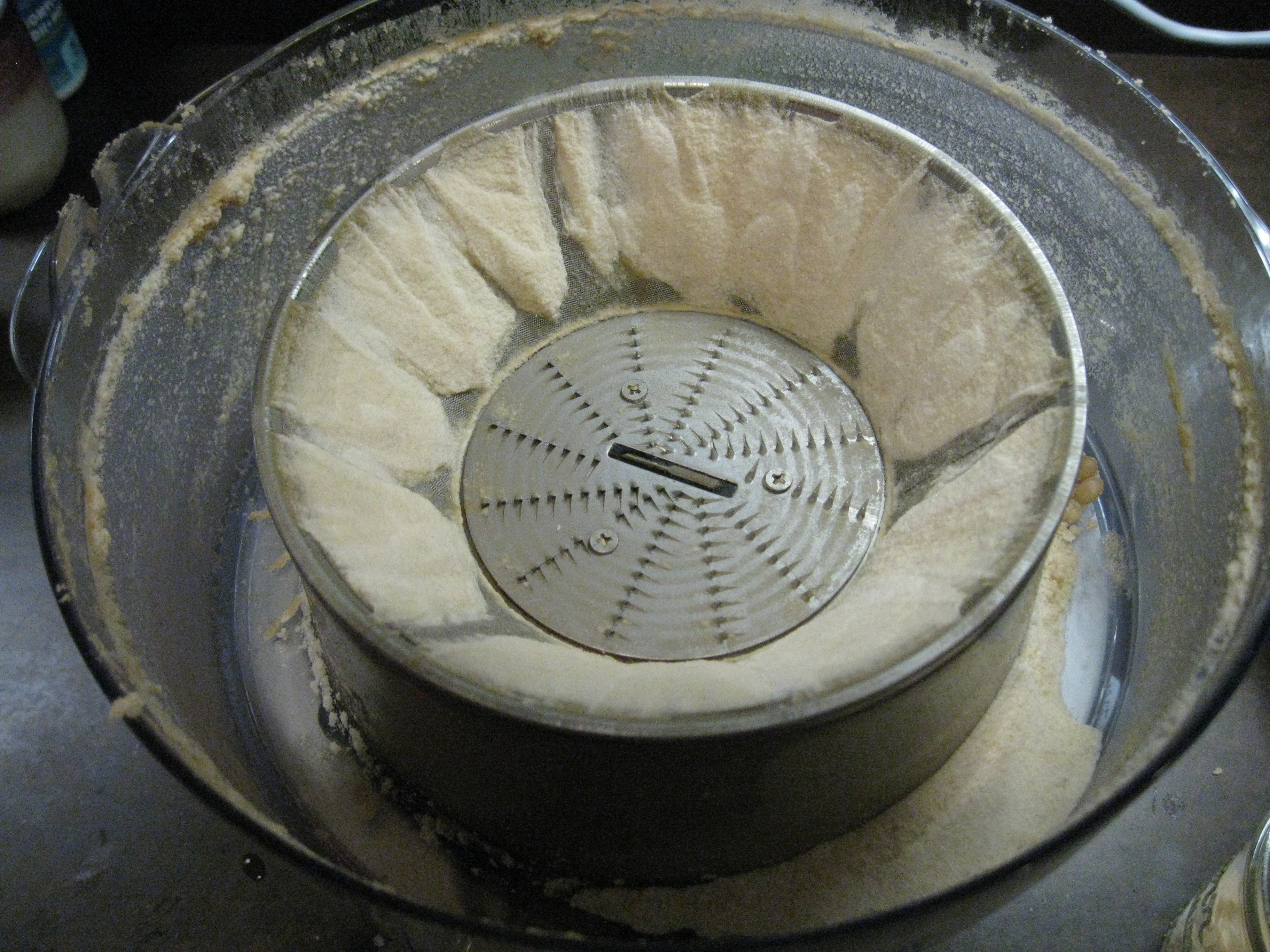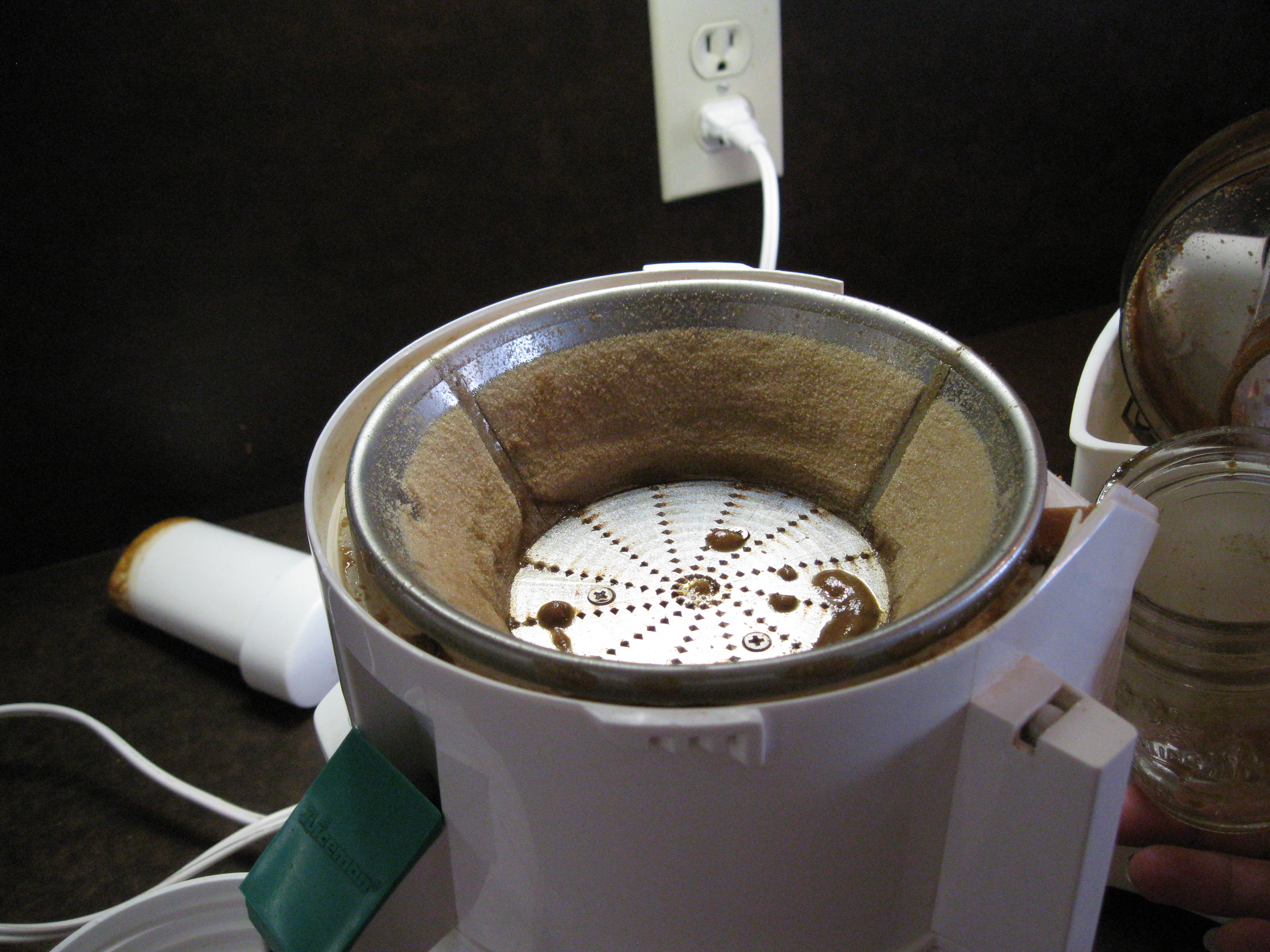 This worked great, with one slight problem: this juicer has a scraper on the top that removes the sugar as it is formed, and dumps it out with the rest of the discards. This makes sense: it is, after all, a juicer, and is just trying to keep itself clean. However, it does not make sense for sugar making, as the sugar, once removed, is not recoverable. I have examined many different types of centrifugal juicers, and they all seem to have this design issue. If we were to get serious about home sugarbeet processing we would need to find a juicer that we could modify so that it would actually collect the sugar… At any rate, here is what we got: