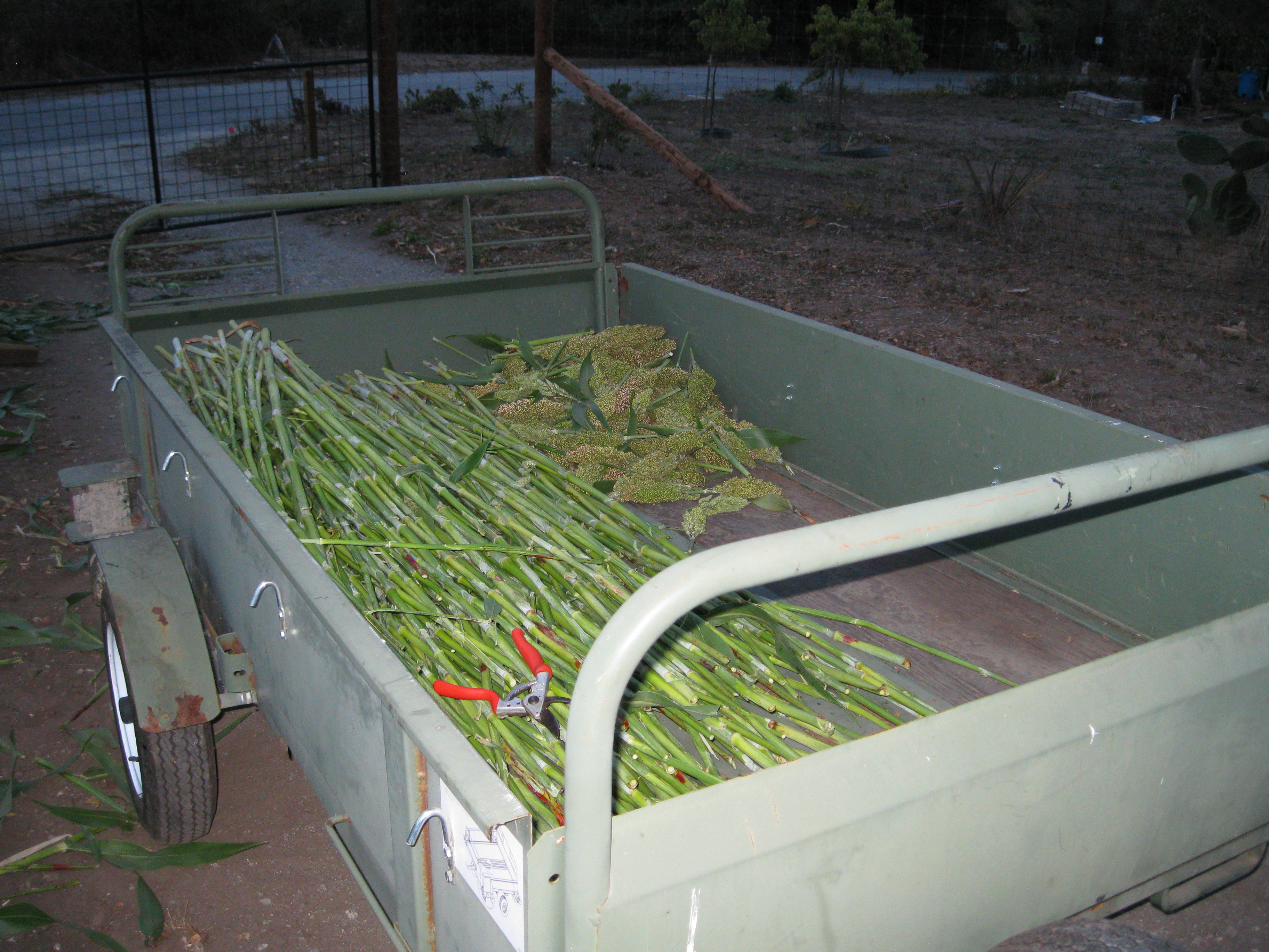 Stacking the stalks for processing, with seed heads collected for chickens.