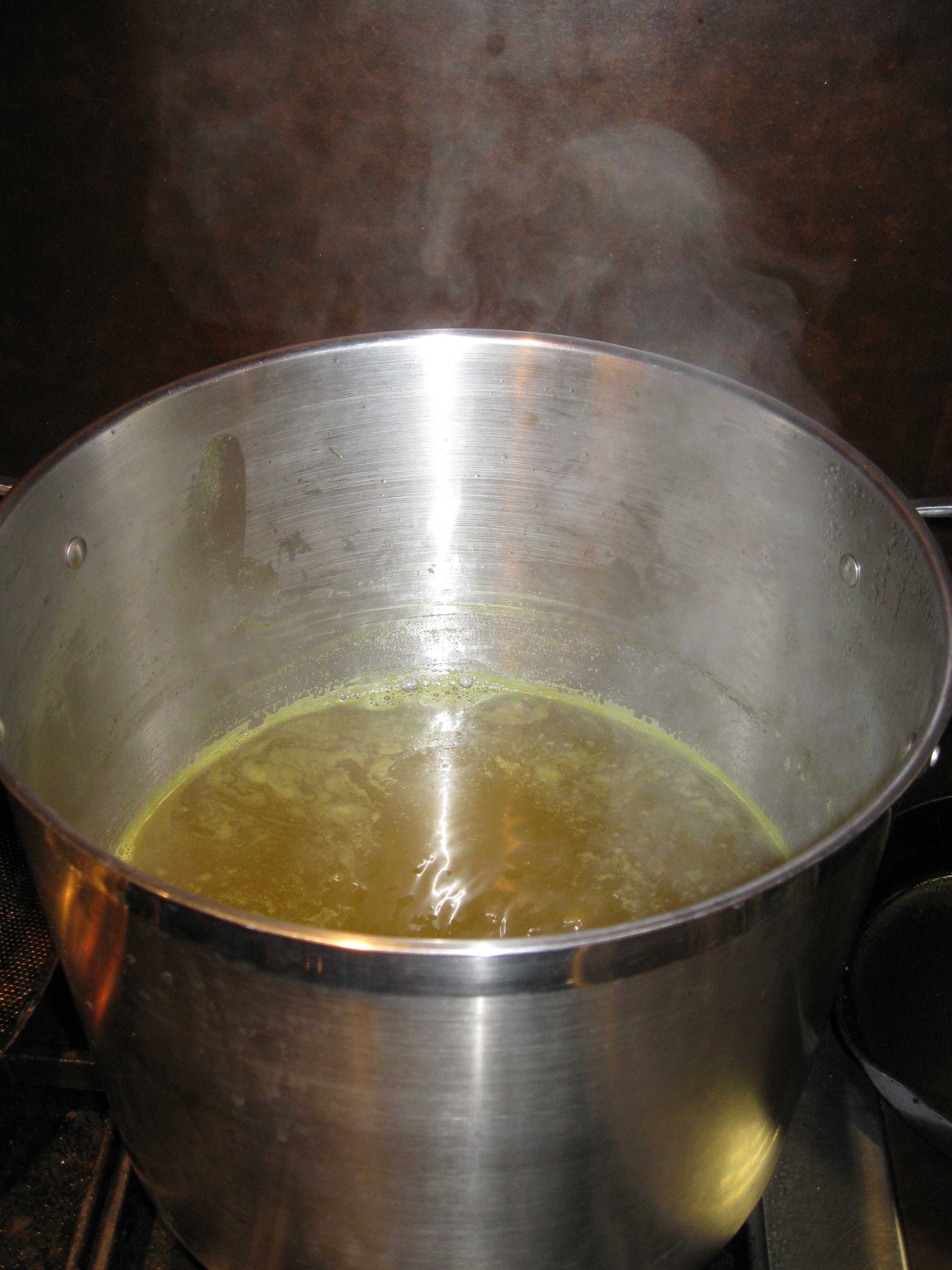 After pressing all the stalks, we filtered the raw juice through cheesecloth and then let the liquid sit for an hour or so to settle out the starches.  We then poured off all the non-cloudy liquid and boiled it down for about 6 hours, stirring it constantly to enhance the evaporation rate and keep it from burning.  The goal was to reach 78-80 Brix, or 226-230°F.  I could not get the temperature to go higher than 224°F; at that temperature, any further cooking caused the syrup to boil wildly, seeming to lose very little more steam, so I decided that it was done at that point.