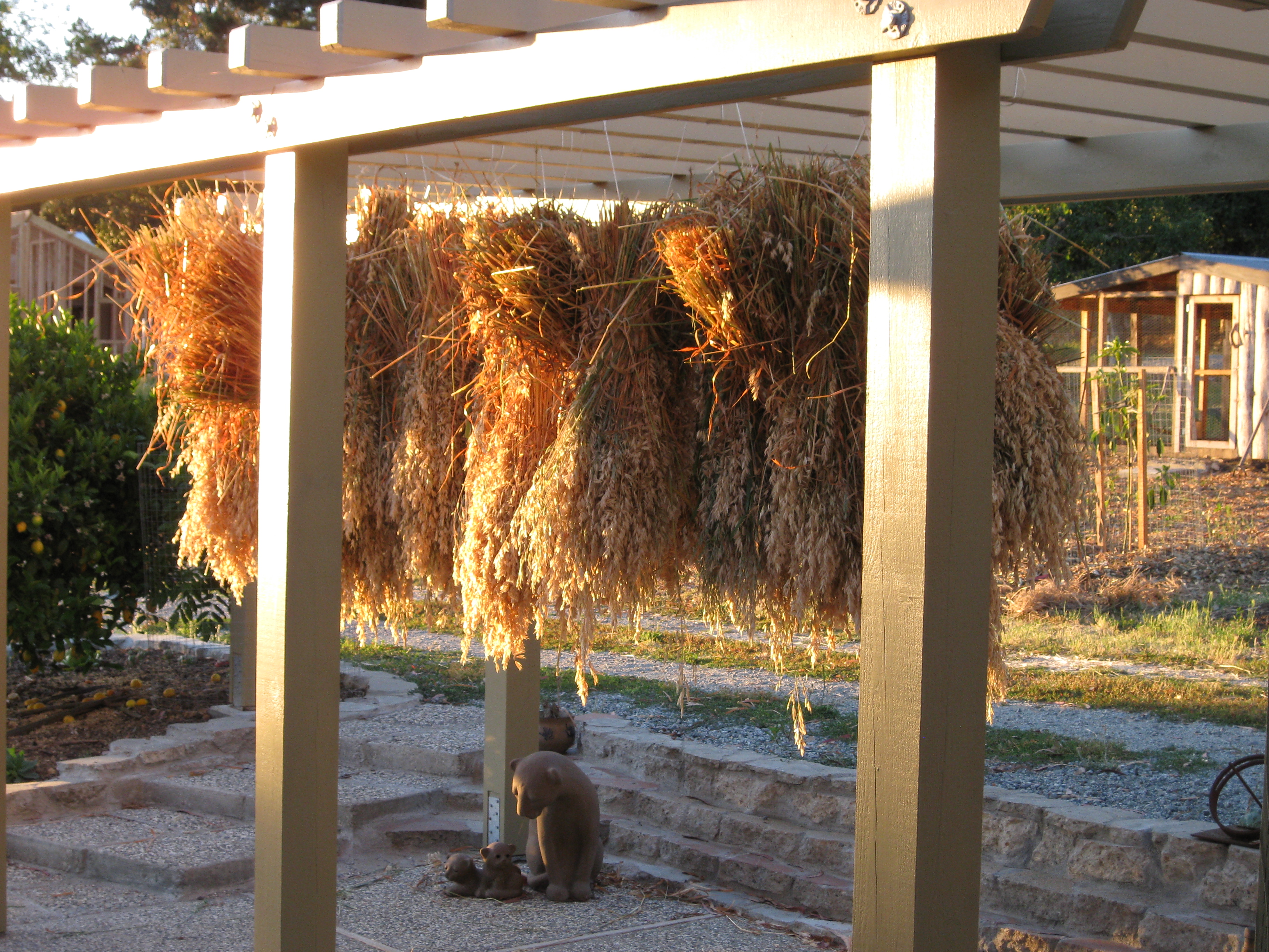 We harvested the crop with sickles, tied it in bundles, and let it hang to dry on our patio.