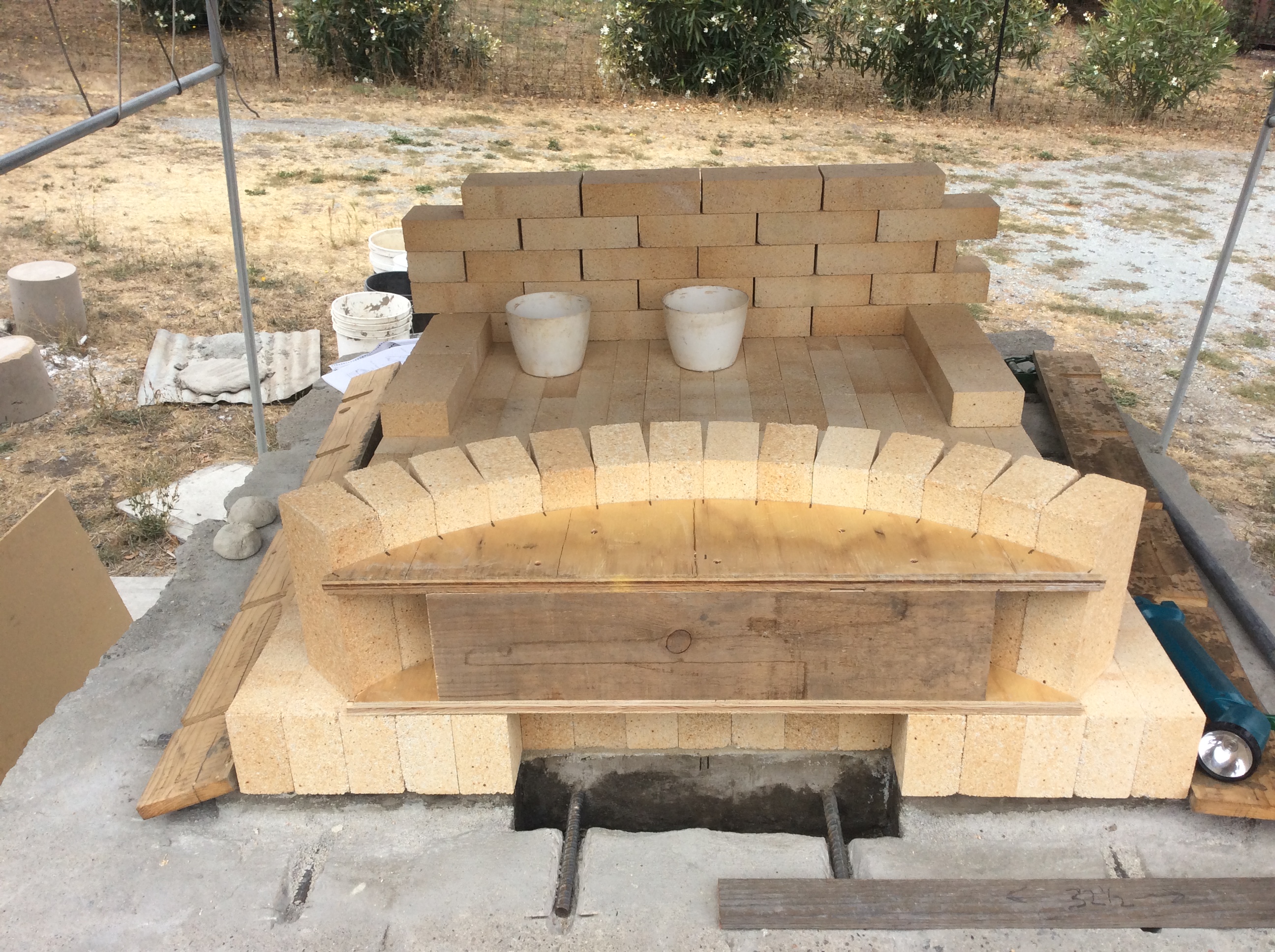 Mock-up of the first five courses of the back wall, plus the arch form with marks indicating placement of each arch brick.