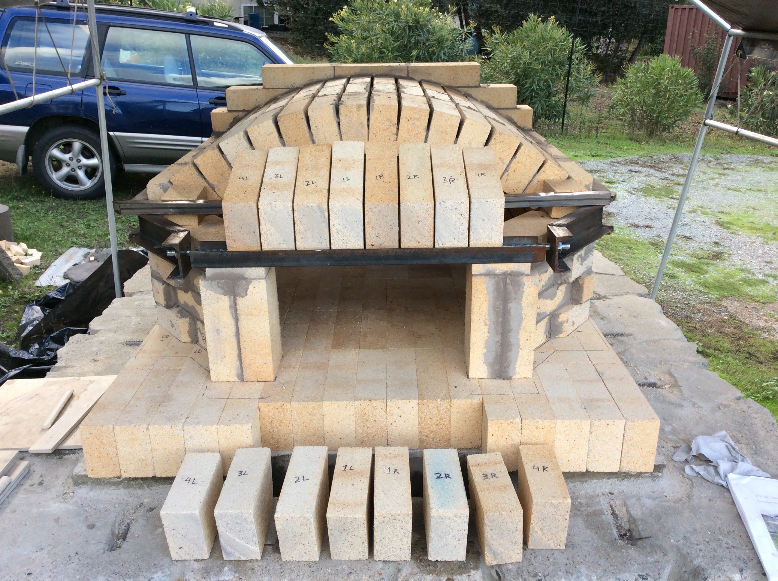 Cutting the second row of bricks to connect with the main arch section of the oven.