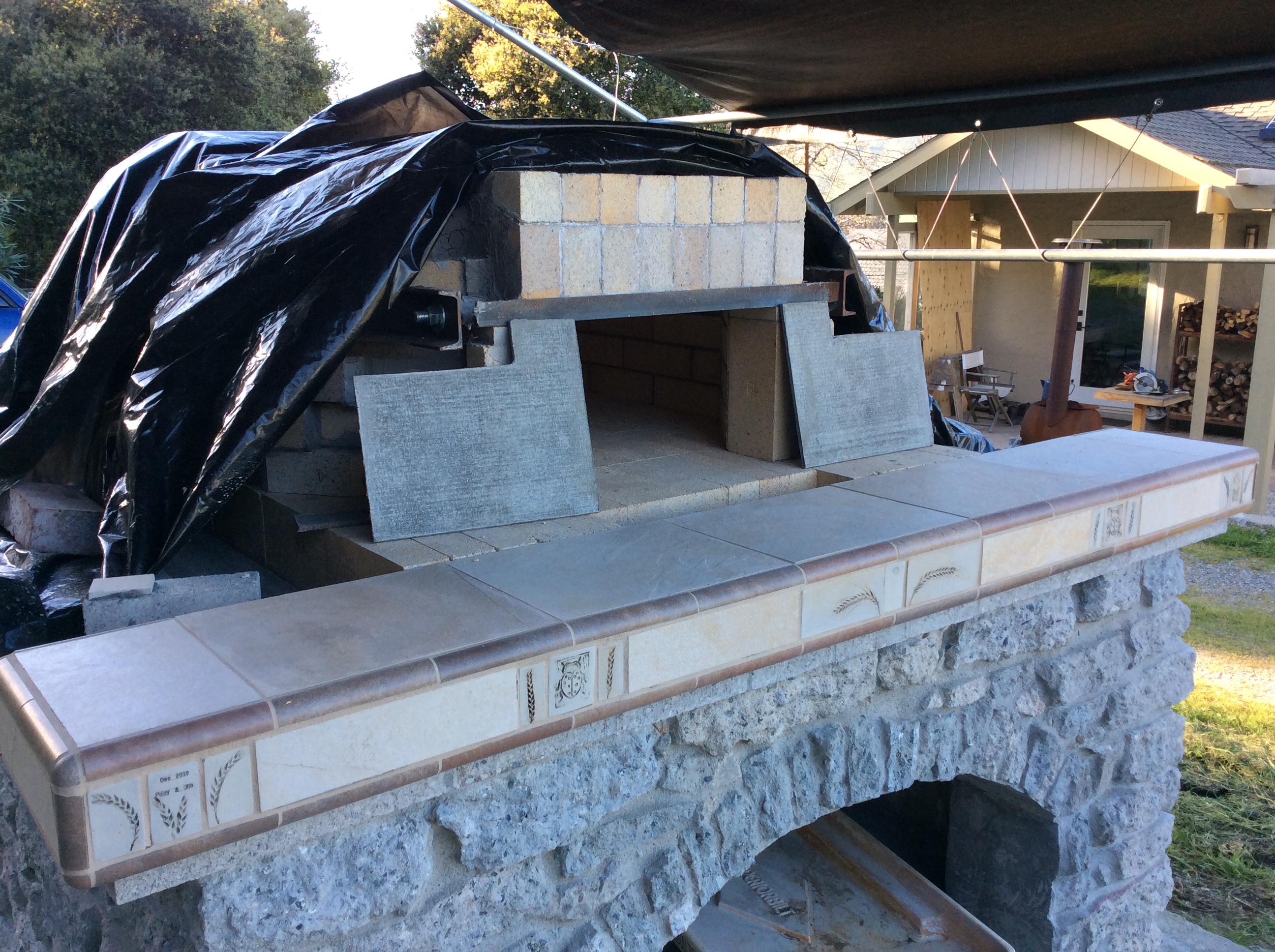Tiles all mortared in. Note the 1/4″ cement backerboard pieces leaning up against the oven – these were placed under the bottom row of bricks that make up the support columns flanking the entranceway of the oven, to allow that whole front section to move across the mantle as the oven expands and contracts with heat.