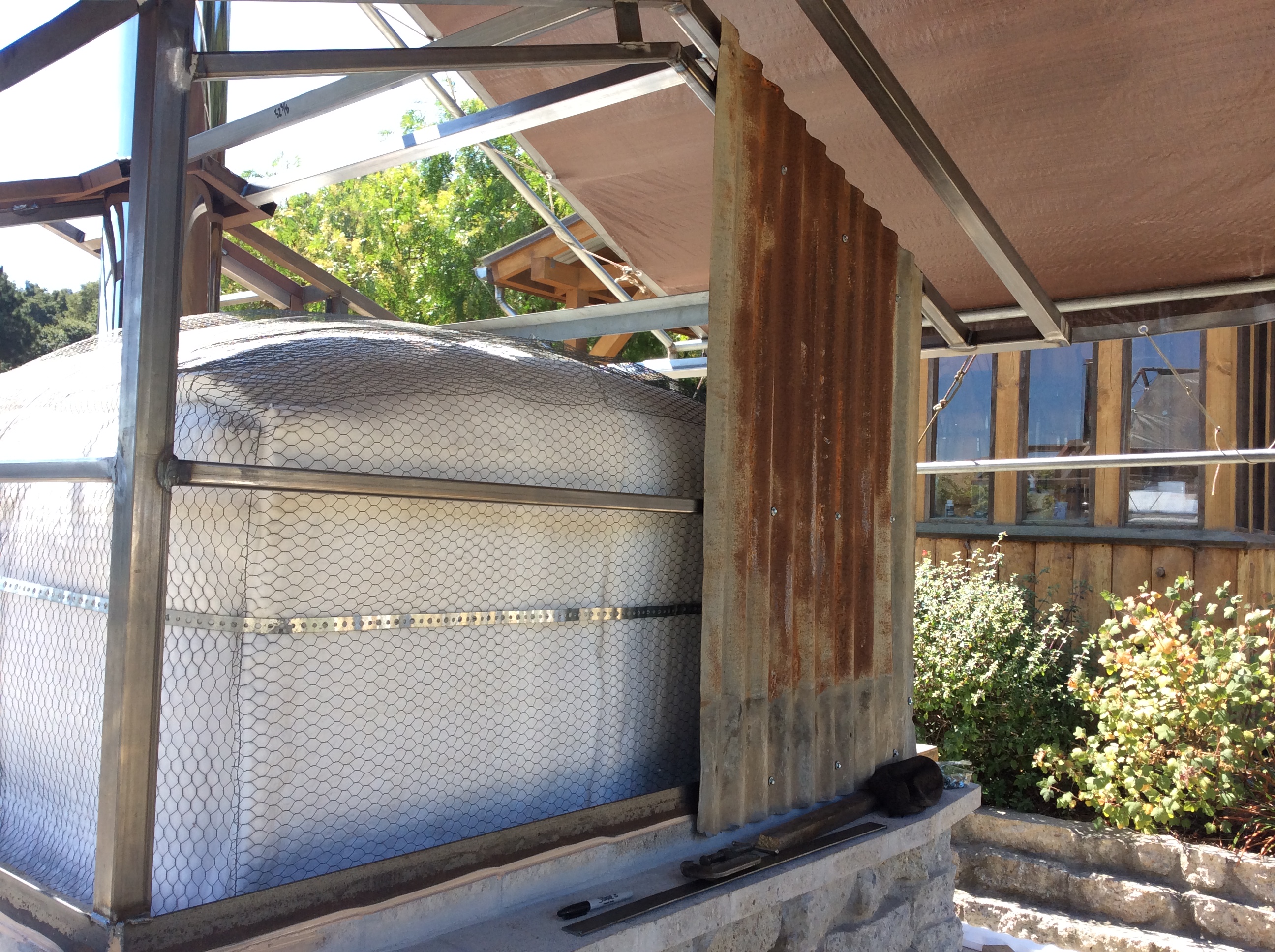 Corregated siding going up on the back of the oven.